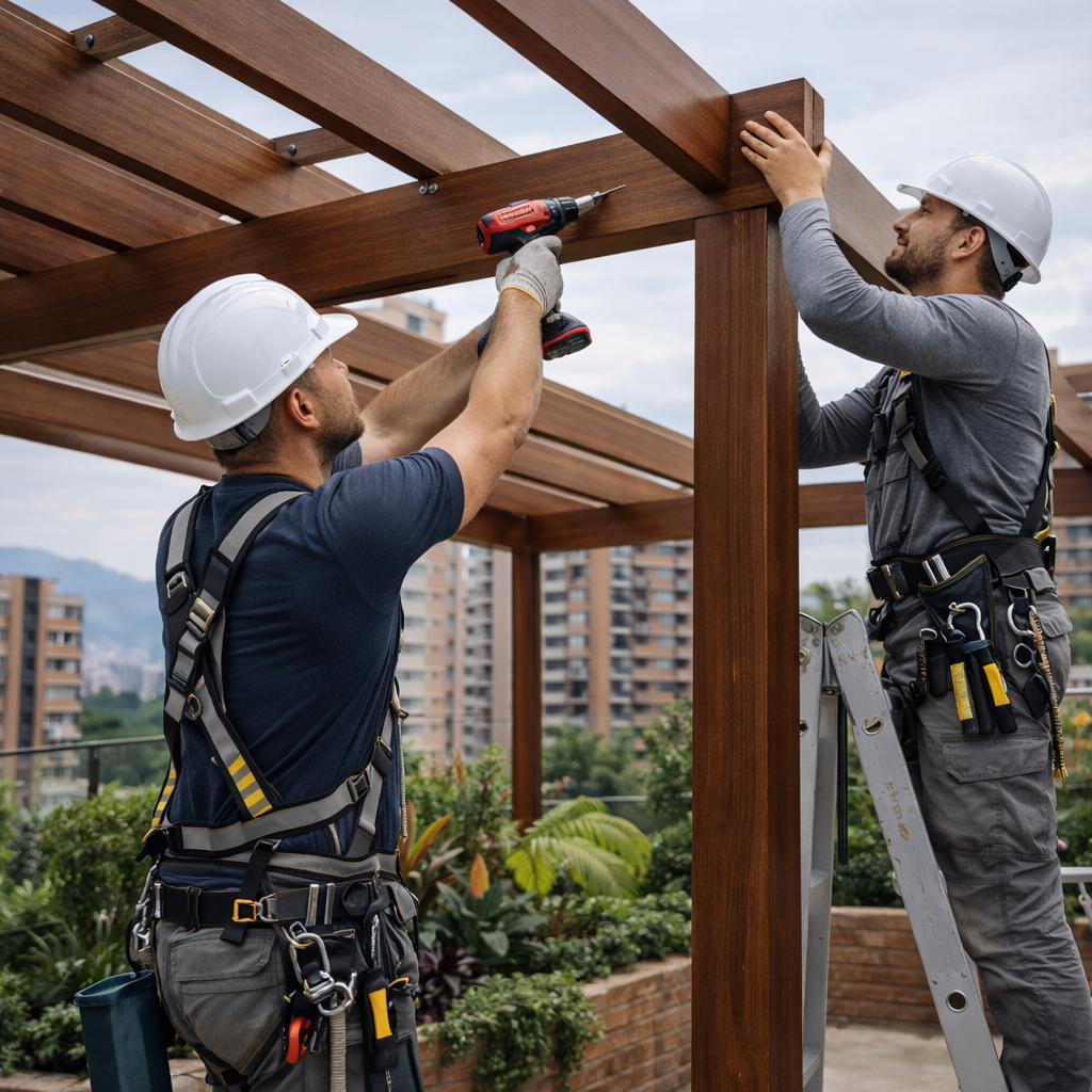 Desarrollamos proyectos de pérgolas para zonas comunes, terrazas, jardines y espacios exteriores de edificios y conjuntos residenciales, creando ambientes más cómodos y protegidos.